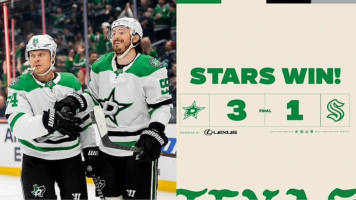 «Сиэтл Кракен»-»Даллас Старз» 1:3. Мэйсон Марчмент и Эса Линделл отдали по 2 результативные передачи, Кейси ДеСмит отразил 35 бросков. «Звёзды» выиграли 6 игру подряд.