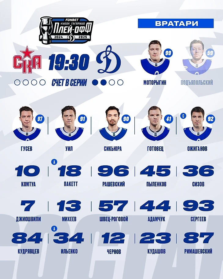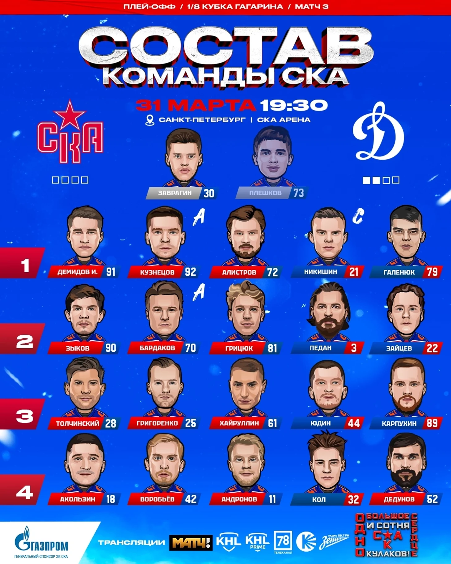 В СКА произошло больше изменений: вместо Павла Мойсевича бэкапом Егора Заврагина оказался Артемий Плешков, среди нападающих в заявку вернулся Владимир Алистров, заменивший Матвея Короткого, Сергей Сапего и Артем Земченок не переоделись на игру среди защитников, зато вернулись на площадку Александр Никишин и Андрей Педан.
