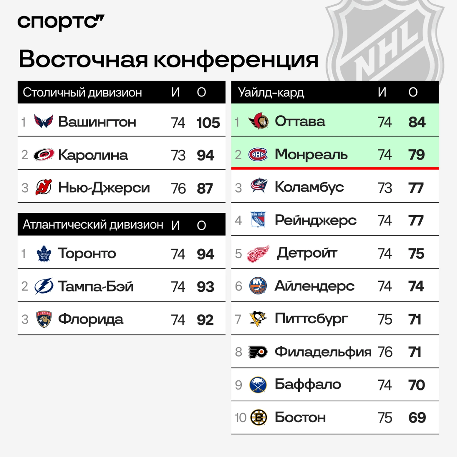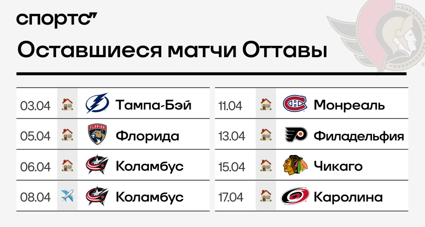 ● В лучшей позиции к финишу регулярки подходит «Оттава». Несмотря на два поражения подряд, у «Сенаторс» солидное преимущество в 7 очков. Для первого за восемь лет выхода в плей-офф достаточно, скорее всего, выиграть половину из оставшихся матчей. Календарь способствует – много домашних игр.