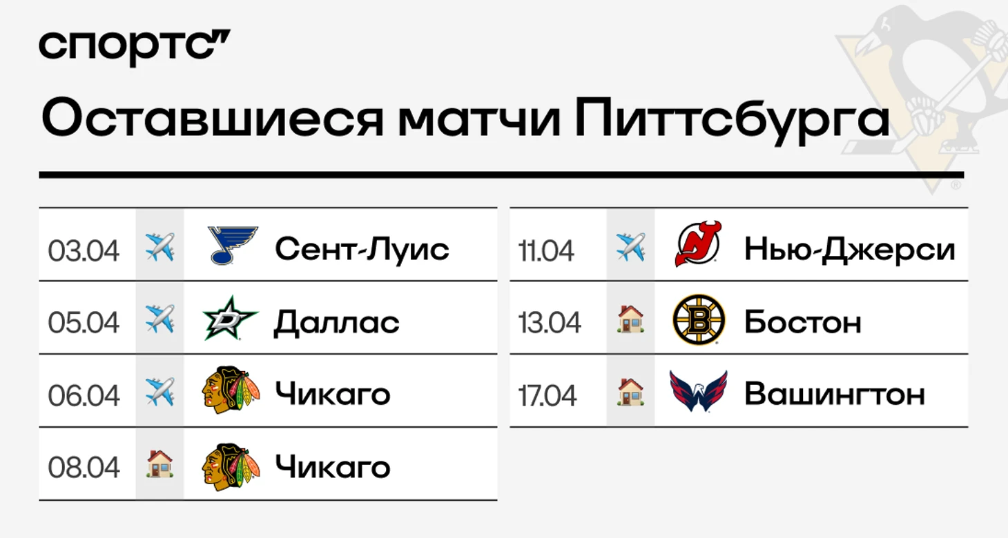 ● Каким образом «Питтсбург» все еще претендует на плей-офф, не расскажет вам даже Кайл Дубас. На концовку регулярки (или сезона) «Пингвинс» даже вернули вратаря Тристана Джерри из АХЛ. Но шансов очень мало. К тому же «Питтсбург» ждут сложные выездные игры с командами Центрального дивизиона.