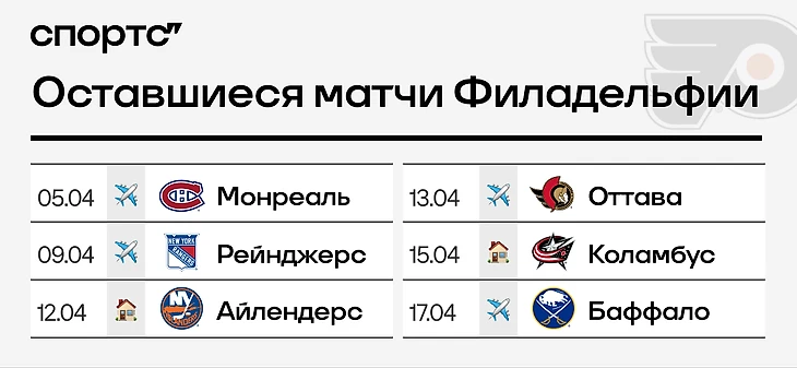 ● «Филадельфия» будто снова обрела крылья и полетела: три победы подряд после увольнения Джона Тортореллы. Особенно воодушевлен Матвей Мичков – у него 4+3 на этом отрезке. Но временного эмоционального всплеска для плей-офф недостаточно. Тем более у «Флайерс» осталось всего шесть игр.