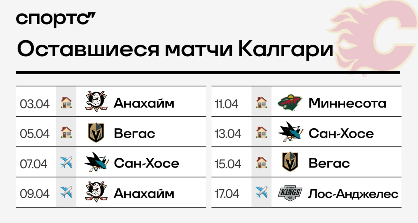 После поражения от «Юты» этих шансов стало меньше. «Калгари» необходимы победы почти во всех оставшихся матчах. И если обыграть «Сан-Хосе» и «Анахайм» вполне реально, то насчет «Вегаса» и «Лос-Анджелеса» есть большие сомнения.