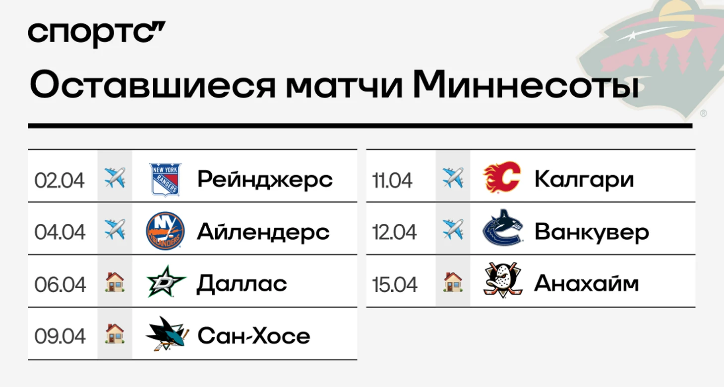 А еще «Миннесота» дважды встретится с прямыми конкурентами – «Калгари» и «Ванкувером». Эти матчи могут многое решить.