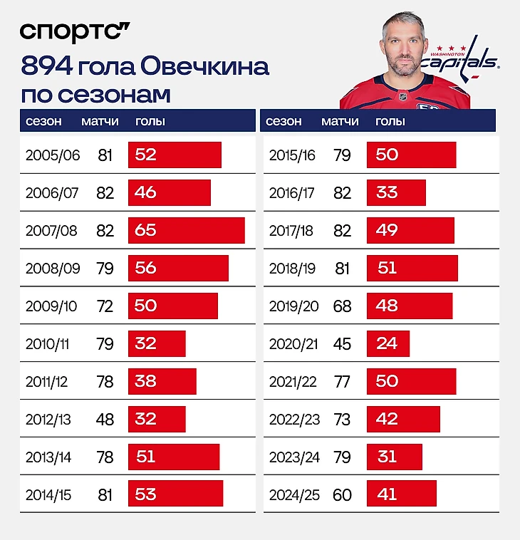 Да, Александр – лучший снайпер в истории НХЛ (пока наравне с Гретцки). Если вы уже прокричались, пропрыгали или хотя бы промурашили этот момент, то просто напомним, как он шел к этому рекорду. Сезон на 40+ шайб в 39 лет – каково?
