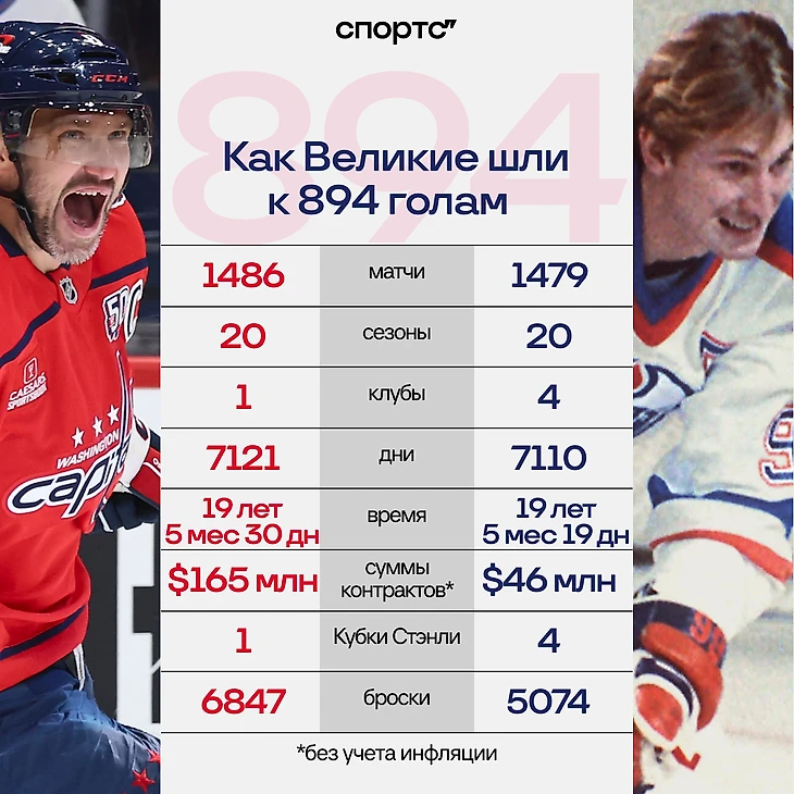 На пути Овечкина были 2 локаута (из-за первого не уехал за океан на год раньше – может, оно и к лучшему), две обрезанных регулярки из-за коронавируса – так что он мог догонять рекорд раньше, чем за 19 лет. Забавно, но при этом он выбил 894 всего на 11 дней позже Гретцки.