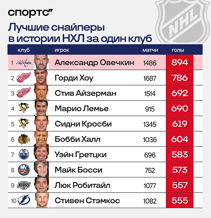 Но, пожалуй, самый интересный пункт в этой таблице – количество клубов. Свой рекорд Овечкин установил в свитере одной команды – и это просто потрясающе. Хотя сама цифра 894 – если вдуматься, что произошло – сама по себе фантастична!