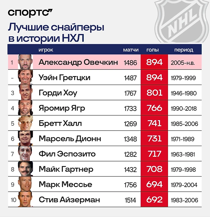 Формально у Овечкина сейчас лучше статистика: 894 в 1486 матчах против 894 в 1487 матчах. Но все же Уэйн провел последние игры в регулярке без голов и свой рекордный выбил чуть раньше. Но ненамного.
