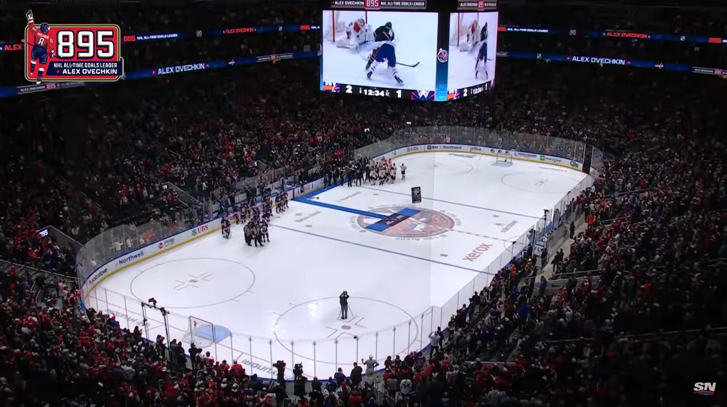 После исторического рекордного гола Александра Овечкина против «Айлендерс» никто уже не думал о самой игре. Матч остановили, а на льду началась торжественная церемония. Разумеется, под скандирование болельщиков: «Ови, Ови!».