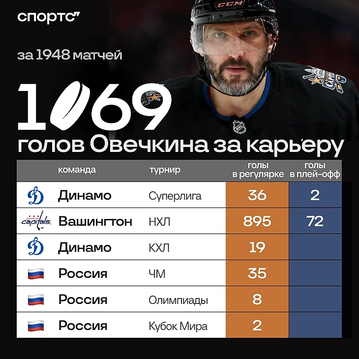 Овечкин – лучший снайпер в истории НХЛ! И все же его профессиональная карьера не ограничивалась одной лигой – была и неплохо подготовившая Суперлига, и локаутная КХЛ, где, кстати, ему хватило матчей в регулярке, чтобы стать чемпионом. Ну и про голы за сборную забывать как-то тоже не хочется. Поэтому количество шайб, заброшенных Ови в своей профессиональной карьере, заметно выше, чем в регулярках НХЛ (хотя бы потому, что мы и Кубок Стэнли посчитали).