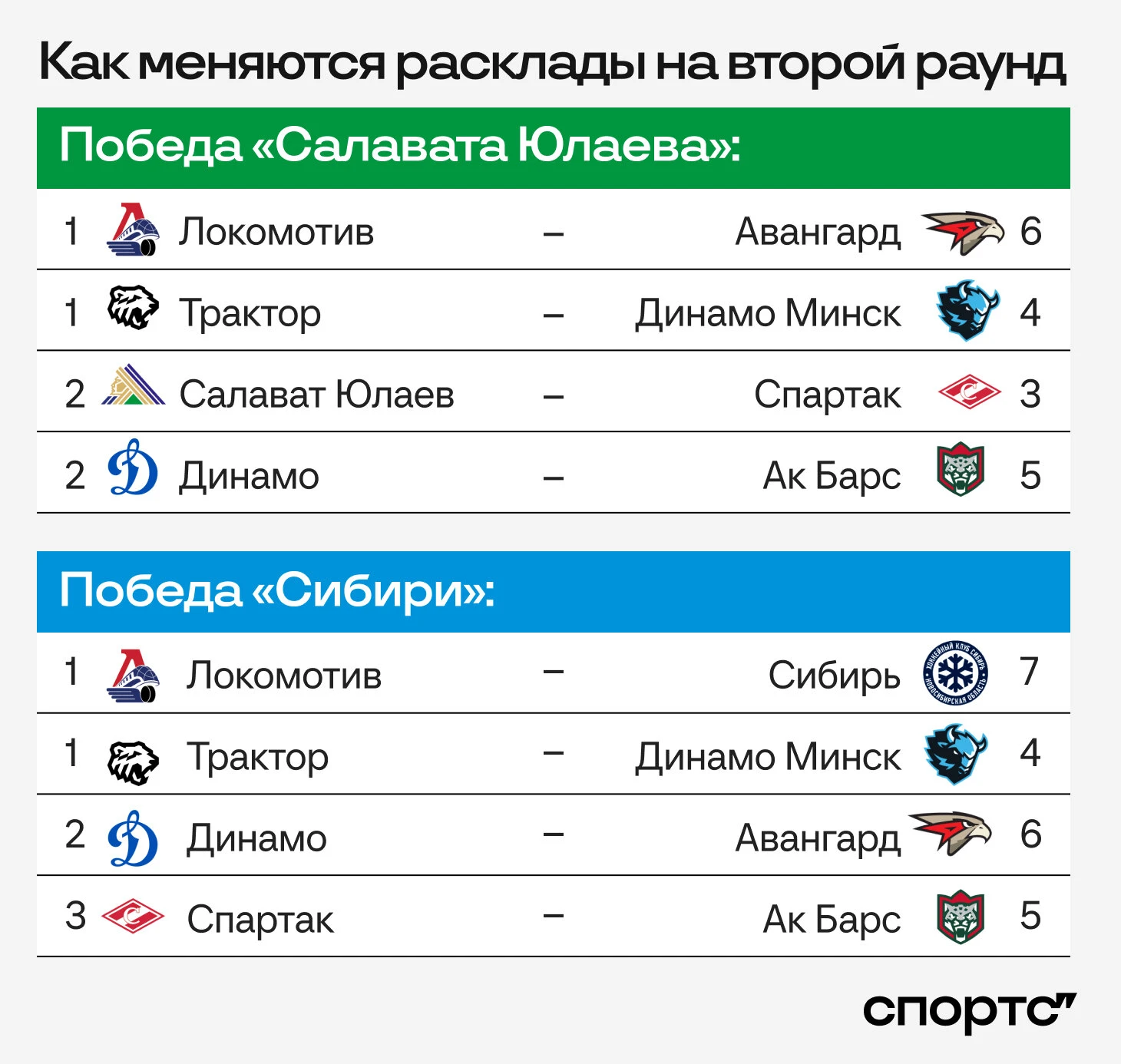 ● Веселее всего сейчас «Спартаку». При победе «Салавата» команда поедет в Уфу и потеряет преимущество домашней площадки. Если победит «Сибирь», то «Спартак» встретится с «Ак Барсом» и начнет второй раунд в Москве.