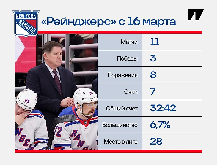 По игре прежние «Рейнджерс» ловко двигались на большинстве и защите – и в ноябре-2024 забарахлили как раз они. Большая проблема, которую раскрывает ужасный финиш сезона-2024/25: не только не починили хоть что-то из этого, а по факту – особенно с большинством – получилось еще хуже.
