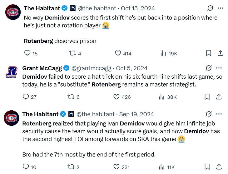 А еще негодовали, когда главный тренер СКА отправлял Демидова в запас или давал мало игрового времени. В целом, общее мнение болельщиков «Монреаля» было таким: после сезона-2024/25 Демидову точно нужно уезжать из Петербурга.