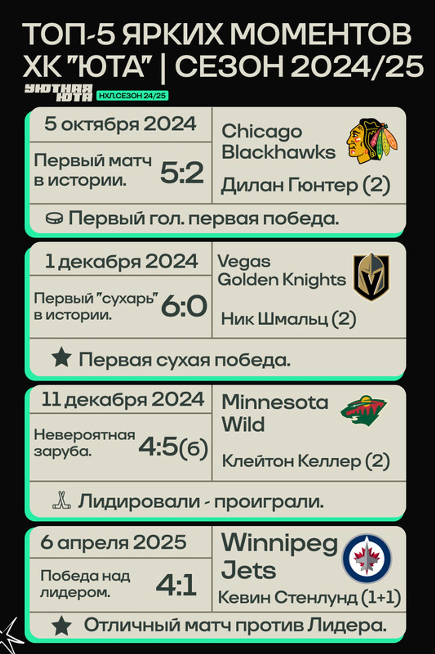 Первый сезон ХК «Юта» в НХЛ — это история о старте с нуля, о преодолении сомнений и о поиске своего лица. Это сезон, который запомнится не только матчами и голами, но и тем, как хоккей покорил новый регион. И, кажется, это только начало.