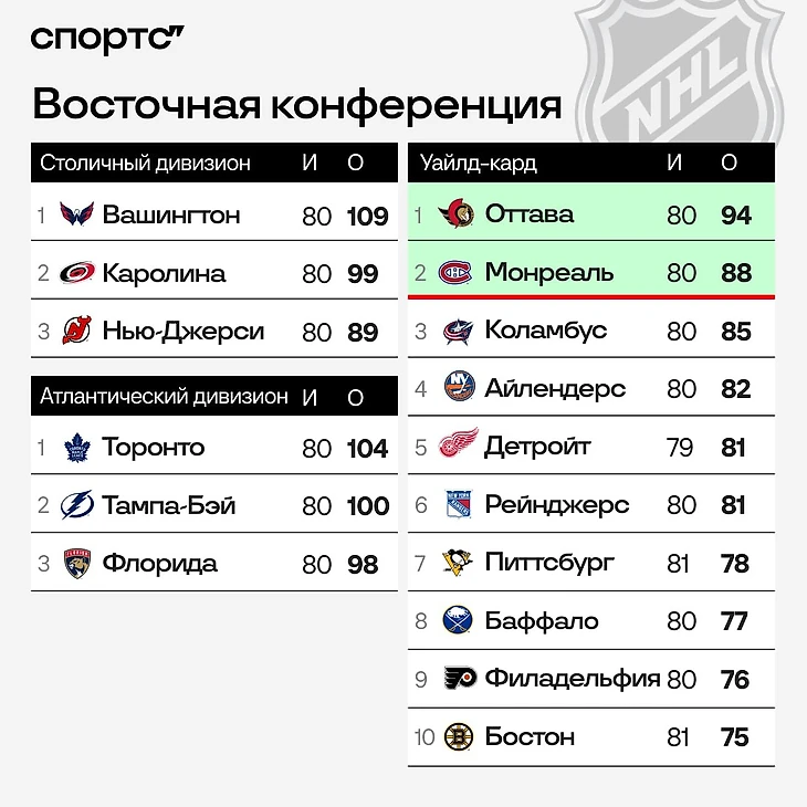 «Коламбусу» нужно выиграть оставшиеся две игры – на выезде с «Филадельфией» и дома с «Айлендерс». У «Канадиенс» тоже осталось два матча – с «Чикаго» и «Каролиной». И если «Монреаль» выиграет хотя бы один, то гарантирует себе уайлд-кард.