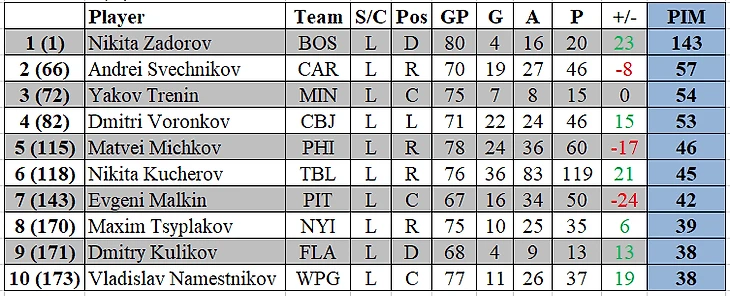 Худшие по показателю полезности среди россиян: Евгений Малкин «-24» (67 матчей, среднее время на льду 17:49); Матвей Мичков «-17» (78, 16:35); Федор Свечков «-17» (50, 12:45); Владимир Тарасенко «-16» (77, 14:46); Егор Замула «-13» (61, 16:32).