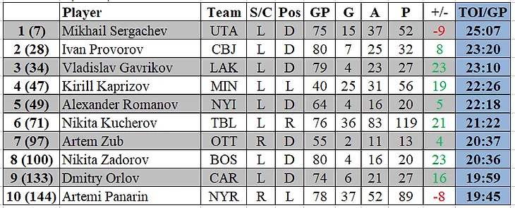 Список лидеров по игровому времени в НХЛ выглядит следующим образом: 1) Зак Веренски («Коламбус») 26:48 (79 матчей); 2) Кейл Макар («Колорадо») 25:43 (80); 3) Куинн Хьюз («Ванкувер») 25:40 (66); 4) Брок Фэбер («Миннесота») 25:29 (77); 5) Миро Хисканен («Даллас») 25:10 (50); 6) Мориц Зайдер («Детройт») 25:08 (79); 7) Михаил Сергачев («Юта») 25:07 (75).