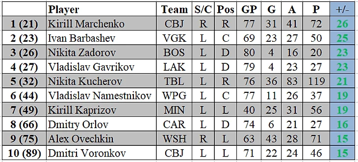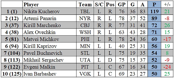 Тройка лидеров среди наших игроков уже не меняется на протяжении 7 недель, уверенно лидирует Никита Кучеров (119 очков). Вторым идет форвард «Рейнджерс» Артемий Панарин, в его активе 89 (37+52) очков. Третье место у Кирилла Марченко (72 очка), далее идет Александр Овечкин с 71 (43+28) очком.