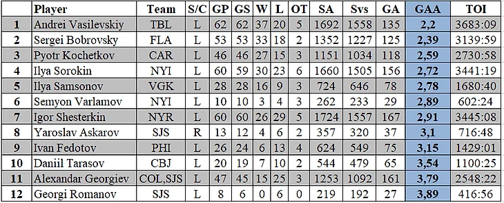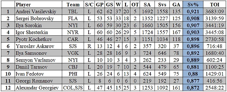 По коэффициенту надежности первое место среди наших вратарей также занимает Андрей Василевский (2.20). Вторым идет Сергей Бобровский (2.39), а третью строчку занимает Петр Кочетков (2.59).