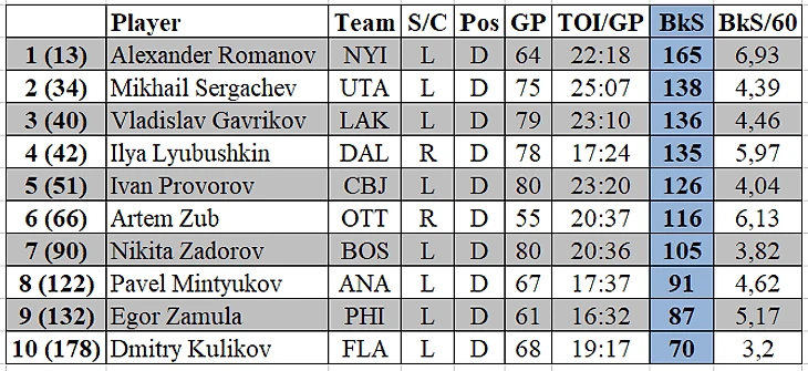 Защитник «Нью-Йорк Айлендерс» Александр Романов продолжает лидировать по количеству заблокированных бросков, в его активе 165 заблокированных бросков в 64 матчах (7 блоков за прошедшую неделю). На вторую строчку поднялся Михаил Сергачев, который заблокировал уже 138 бросков соперников. Третье место у Владислава Гаврикова (136 в 79). Илья Любушкин отстает всего на один блок от Гаврикова.
