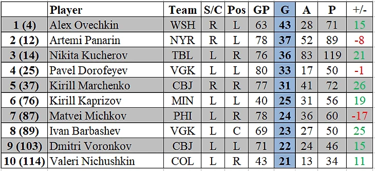 Александр Овечкин уверенно лидирует в списке снайперов среди российских игроков, на счету Овечкина уже 43 шайбы в 63 матчах (0.68 гола за игру). Вторым идет Артемий Панарин с 37 голами, третью строчку занимает Никита Кучеров (36 голов в 76 матчах).