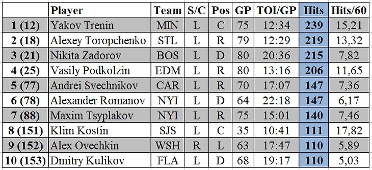 Яков Тренин продолжает лидировать по силовым приемам среди наших хоккеистов, на прошедшей неделе Тренин добавил еще 10 хитов, теперь на его счету 239 силовых в 75 матчах. Вторым идет форвард «Сент-Луиса» Алексей Торопченко, в активе которого 219 силовых приемов в 79 встречах. Третье место у защитника «Бостона» Никиты Задорова – 215 силовых приемов в 80 матчах. Более 200 силовых приемов провели 4 наших игрока, помимо вышеперечисленных более 200 хитов у Василия Подколзина (206).