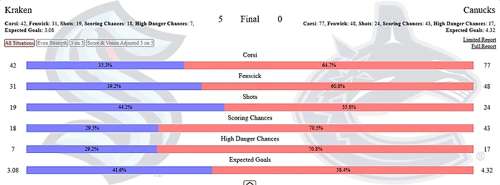 То поражение еще не было критичным, а вот оглушительное фиаско в домашней игре с «Кракеном». Очень тяжело объяснить и оправдать разгром в такой момент от немотивированного и выступавшего соответствующим образом соперника. Да, это НХЛ, где опасны все команды, но все же. При этом «Ванкувер» не играл плохо, просто у него ничего не залетело, а у соперника залетело все. 64,71% Corsi For, 17-7 по моментам повышенной опасности, 4,32 – 3,08 по ожидаемым голам. А на табло 0:5 (последняя шайба пришла в пустые ворота).