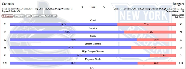 Тем не менее «Ванкувер» отправился в гости к «Рейнджерс» на позитиве из-за набранного в безнадежной ситуации очка и выдал, возможно, лучший матч сезона. По крайней мере, команда установила сразу два личных рекорда сезона: по собственным броскам (39) и минимальному количеству бросков соперника (12). По ожидаемым голам перевес «Ванкувера» был значительным: 3,93 – 1,85. Но еще внушительнее ситуация выглядела по шансам повышенной опасности: 16-3. Надо ли говорить, что «Рейнджерс» победили со счетом 5:3?! Кевин Ланкинен играл, заболевая гриппом, а еще по ходу встречи выбыли из строя Элиас Петтерссон и Нильс Хегландер, которые после матча отправились домой, больше не сыграв в самом длинном турне года, что, на мой взгляд, окончательно приговорило команду.