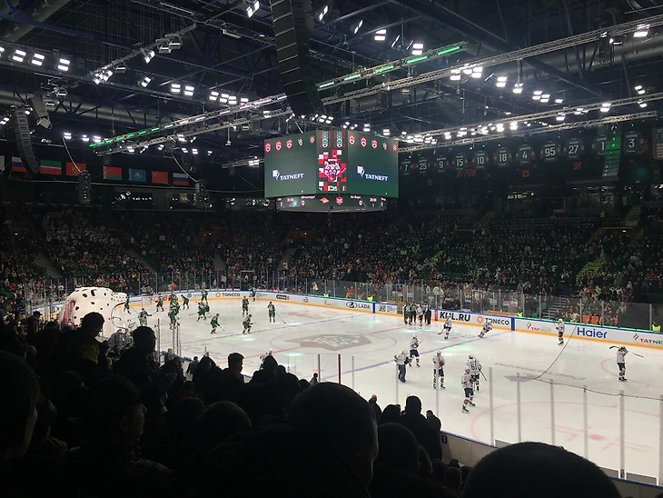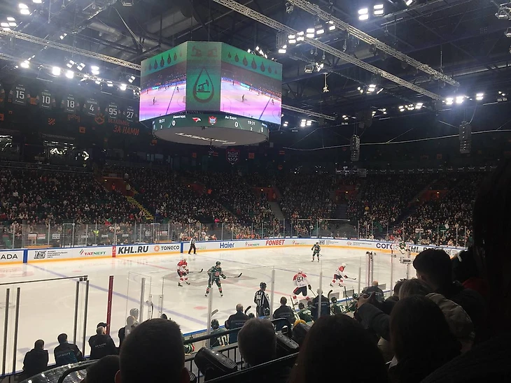 Вторую игра, которую я посетил была последней в регулярном чемпионате. «Ак Барс» пребывал в ранге лидера конференции и уже не отдал бы никому первое место, а вот для «Авангарда» матч имел прямое турнирное значение. В случае победы омичи выходили бы на второе место в турнирной таблице и попадали на «Адмирал» в первом раунде Кубка Гагарина. Поражение отправляло «ястребов» на третью позицию и определяло в соперники «Сибирь». При этом гости прибыли в столицу Татарстана в экспериментальном составе.