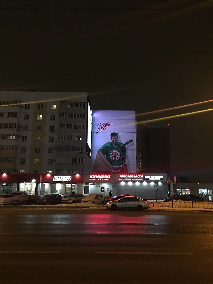 Выйдя с арены, я увидел граффити с капитаном и легендой местной команды Данисом Зариповым. На рисунке спортсмен в командной форме, с плащом и тюбетейкой на голове держит в одной руке клюшку, в другой – эчпочмак (национальное татарское блюдо). Над рисунком размером 13,5 на 16,5 метра и общей площадью 223 квадратных метра художники работали 40 часов.