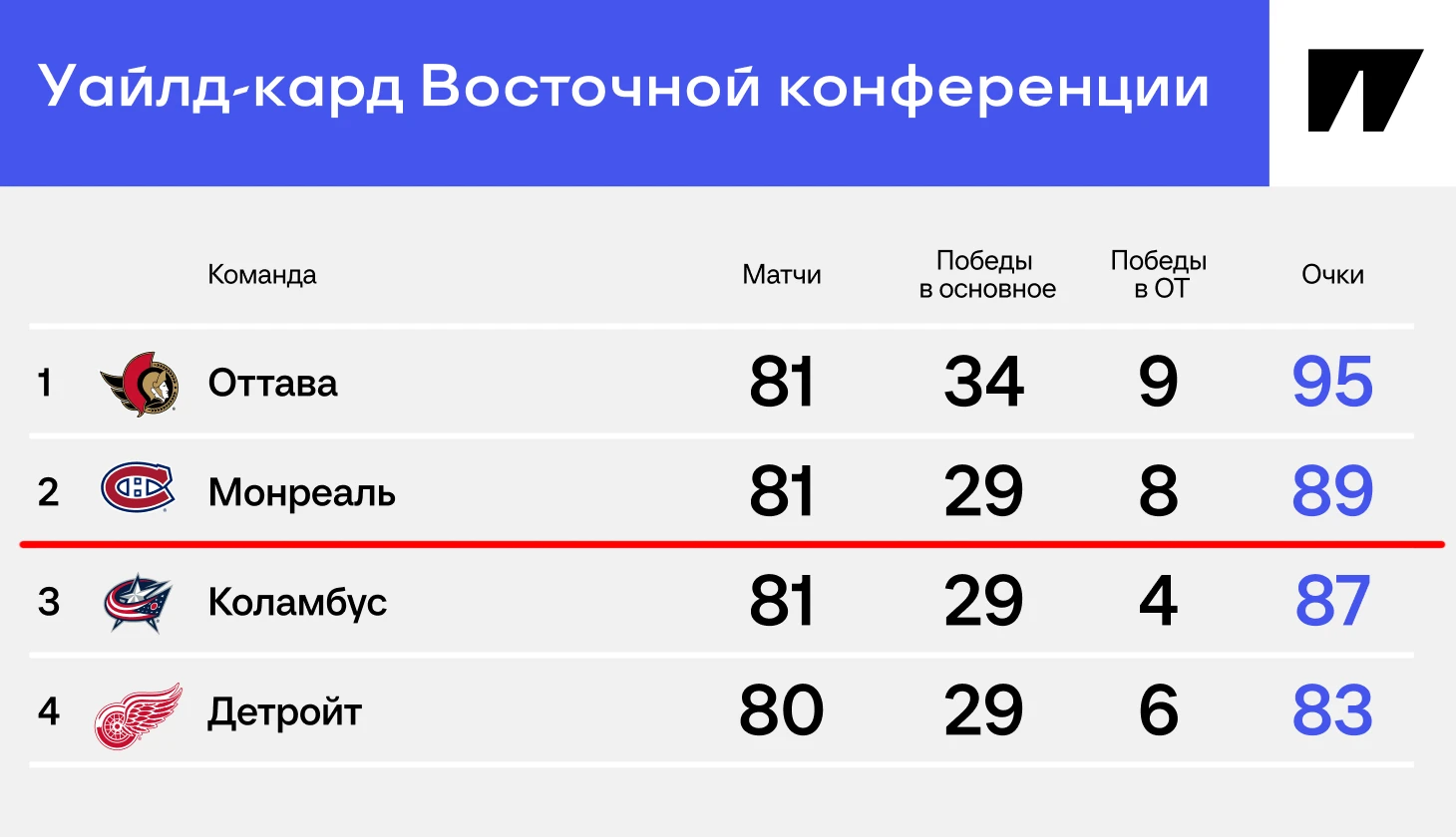 ● поражение «Монреаля» в основное время в своем матче и победа «Коламбуса» в основное время в следующей игре. Тогда при равенстве очков «Блю Джекетс» окажутся выше за счет большего количества побед в основное время.