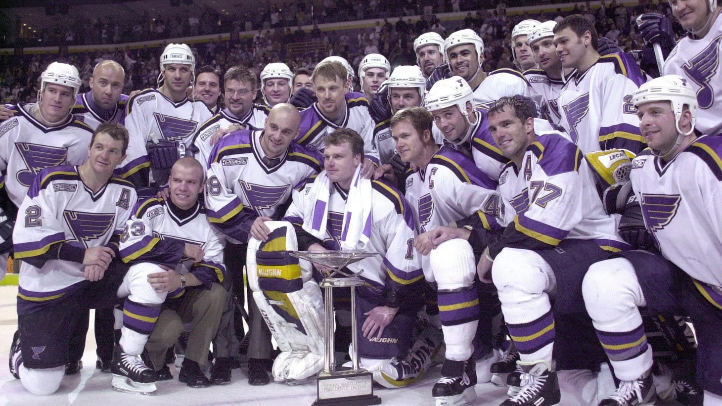 Один из старейших клубов НХЛ смог добраться до чемпионства в регулярке намного лет раньше, чем до заветной чашки. Триумф в сезонах регулярного первенства пришелся на 1999/2000 г., т.е. ровно четверть века назад. Ждать этого успеха команде пришлось 33 года, но вот главный Кубок в тот сезон не покорился; в четвертьфинале Запада они уступили «Шаркс». Лишь спустя 19 лет «блюзмены» вписали себя в историю, взяв Кубок Стэнли, который также пока что остается для них единственным, как и Президент-Трофи. Сент-Луис стал 9-м клубом взявшим регулярку. По ее итогам «блюзмены» набрали 114 очков.