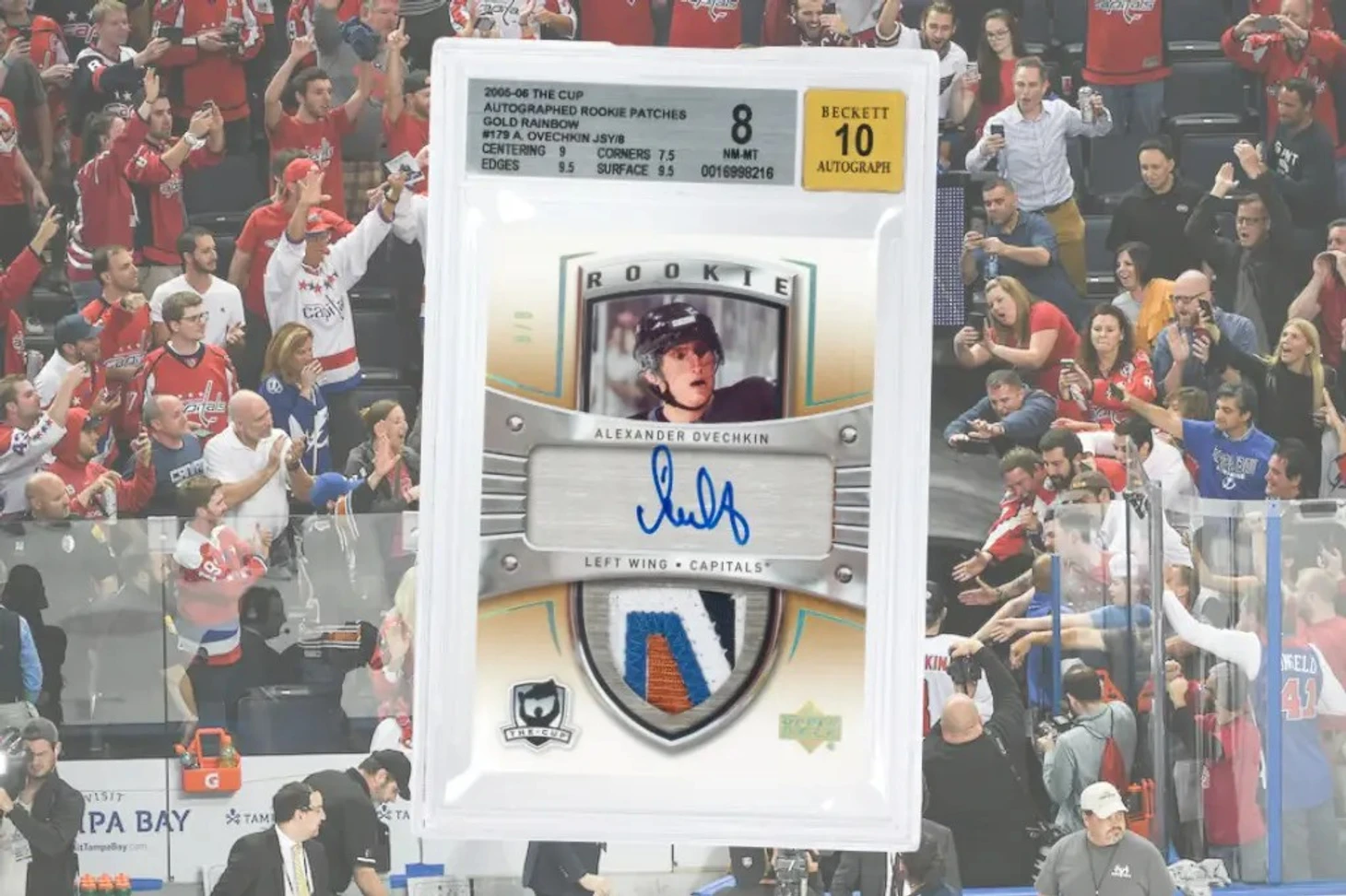 В понедельник вечером карта Овечкина 2005-06 Upper Deck The Cup Hockey Autographs Rookie Patches Gold Rainbow с номером /8 и градацией BGS 8 с автографом №10 была продана за 381 000 долларов на аукционе Sotheby’s в рамках аукциона «Нестареющие титаны | Легендарные спортивные карты».