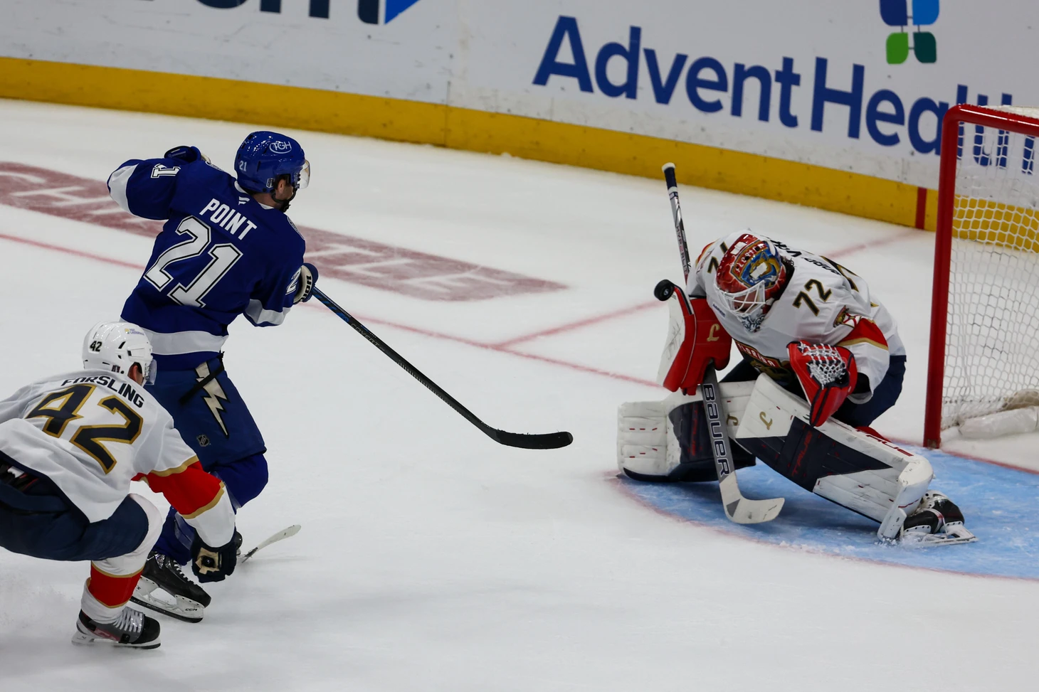 Не прошло и двух минут, как «Лайтнинг» организовали еще один убойный момент. Коннор Гики нашел Брэйдена Поинта, который оказался один на один с Бобровским. Поинт, лучший снайпер команды в регулярном сезоне, обманул вратаря финтом, открыв левую часть ворот, но его бросок с бэкхенда прошел мимо.