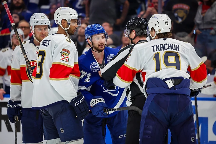 «Флорида» ответила хладнокровно. На пятой минуте первого периода Нейт Шмидт, защитник третьей пары, который стал неожиданным героем серии, получил передачу от Сэма Рейнхарта и нанес бросок с верхней части правого круга вбрасывания. Шайба, пущенная без помех, пролетела мимо Андрея Василевского, который слегка сместился к ближней штанге, оставив дальний угол открытым. Этот гол, третий для Шмидта в двух матчах, был из разряда тех, что Василевский отражает в 99 случаях из 100. Бросок едва ли можно назвать опасным, но в плей-офф даже такие шайбы становятся роковыми.