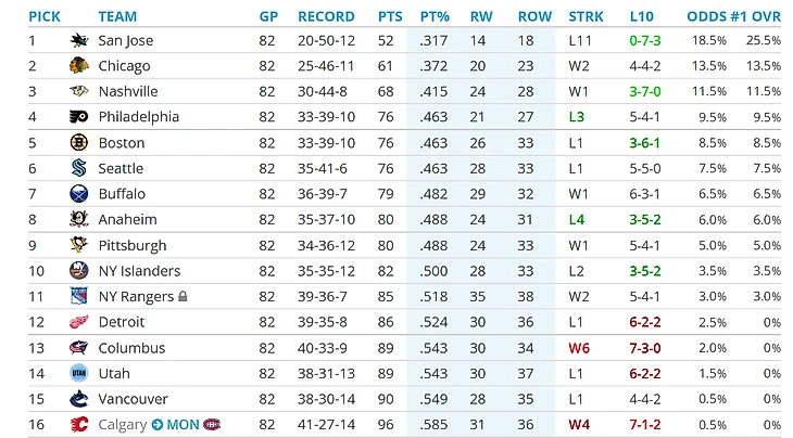 Ниже картинка с порядком выбора на драфте. Обратите внимание, какие высокие выборы у ряда клубов и вспомните их задачи на следующий сезон. Пока разумеется, результаты лотереи не учтены.