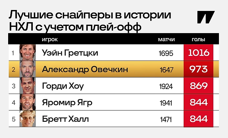 Да, в НХЛ принято разграничивать статистику регулярки и плей-офф (это все же два разных турнира), однако про сводные цифры изредка вспоминают даже за океаном – тем более Овечкин дал повод. И прямо сейчас он снова участвует в гонке (хотя не такой громкой – он уже лучший снайпер в истории): в общем, если суммировать все голы хоккеистов в регулярке и плей-офф, то Уэйн Гретцки обгоняет Овечкина на 43 шайбы.