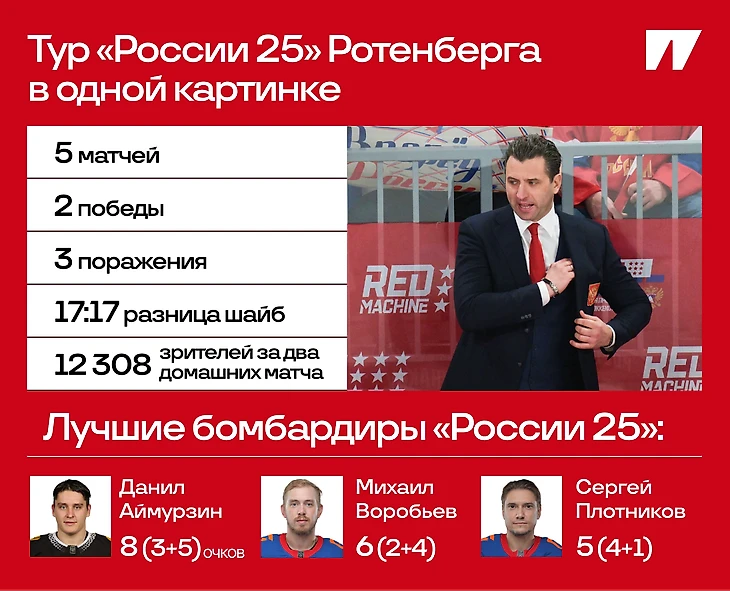 ● Есть и потеря: Прохор Полтапов пропускал заключительный матч турне из-за травмы. «Россия 25» справилась без него. Ротенберг радовался после завершения турне: «Все эти матчи у нас новая сборная, новая команда. Всего пять человек у нас с предыдущего турнира остались». Полтапов как раз и был одним из представителей этой пятерки.