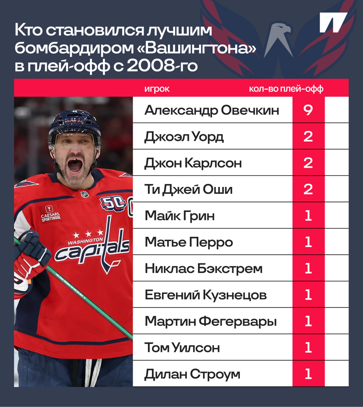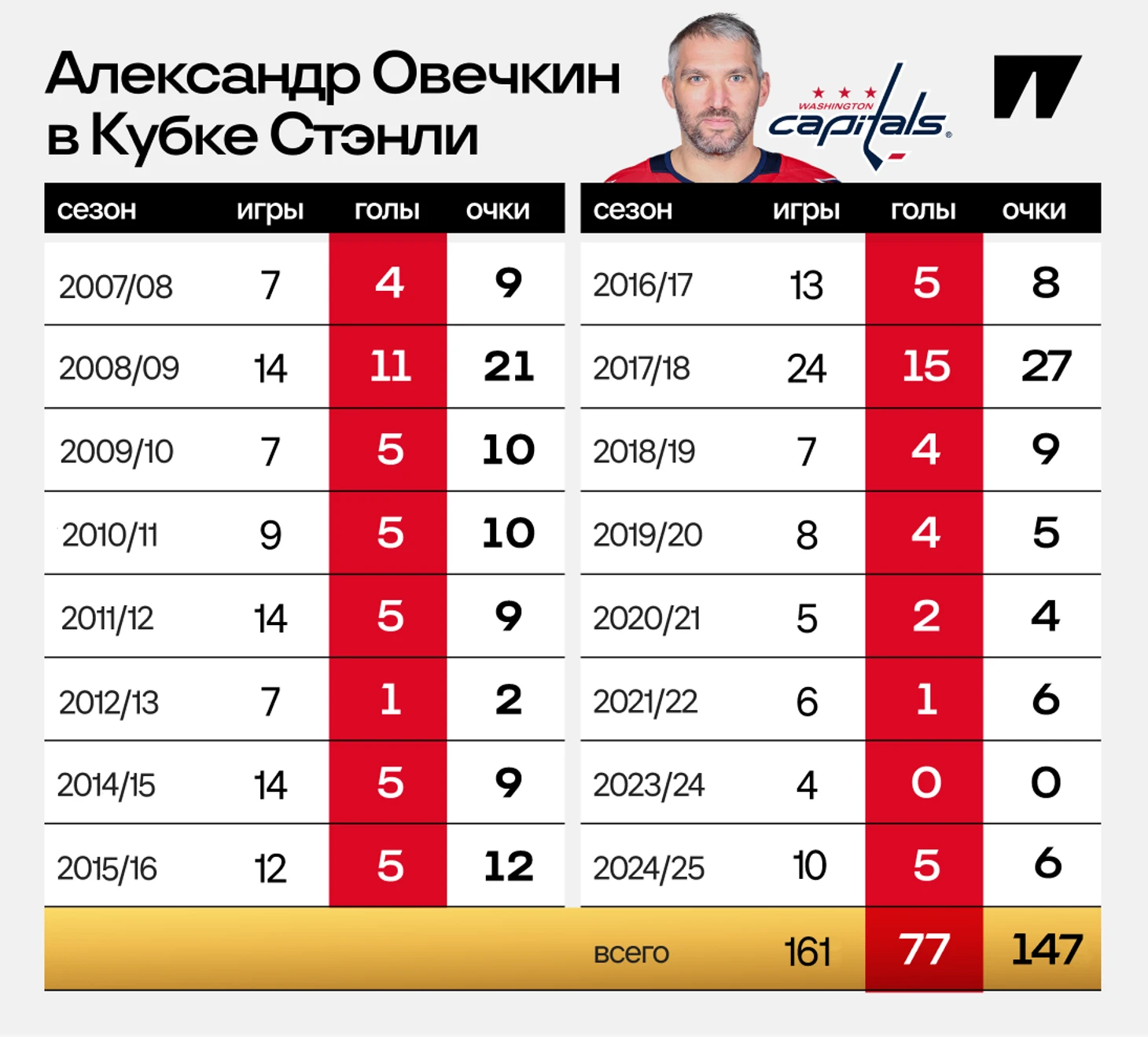 В нынешней серии с «Каролиной» Овечкин набрал только 1+0 в пяти матчах. И может показаться, что он не вложился в возможный успех «Вашингтона». Но все же капитану уже 39 лет – он этим последние 20 сезонов только и занимался. За это время он 9 раз (из 16 возможных) становился лучшим бомбардиром команды в кубковых матчах.
