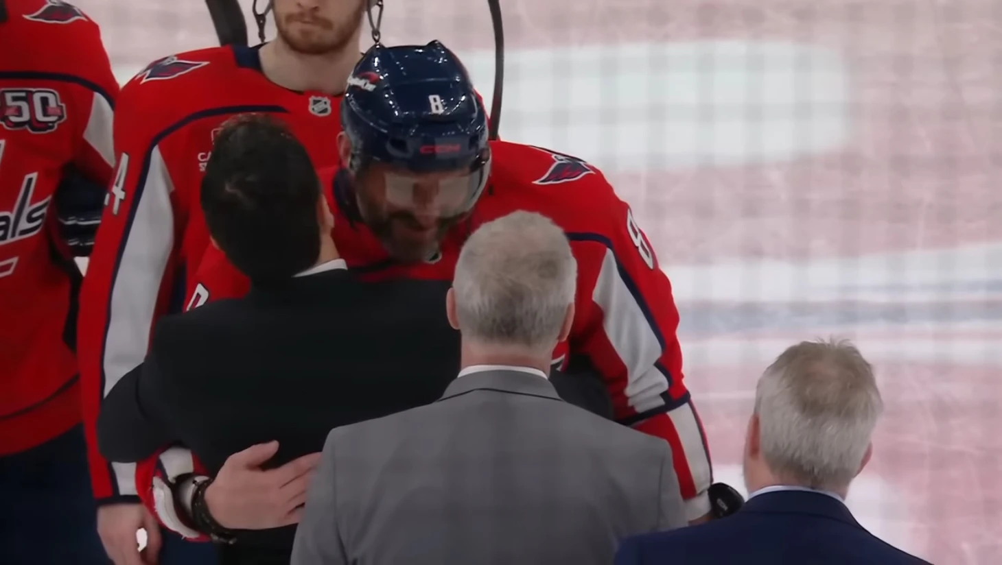 Ови не раз улыбался во время рукопожатия. Иногда даже смеялся. Например, когда очередь дошла до Дмитрия Орлова, с которым Александр много лет играл в «Вашингтоне».