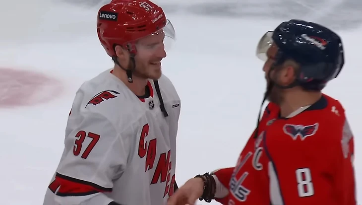 Капитаны команд тепло пообщались друг с другом. Джордан Стаал часто выходил против Овечкина в плей-офф за «Питтсбург» и «Каролину», но никакой неприязни между игроками нет и подавно. Наоборот, только взаимное уважение.