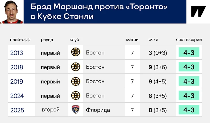 У «Флориды», кстати, был и еще один узкоспециализированный персонаж – Брэд Маршанд, выменянный на дедлайне из «Бостона». Как будто «Пантерс» знали, с кем будут играть во втором раунде – и взяли нападающего, который никогда в плей-офф не проигрывал серию «Торонто», хотя дело всегда доходило до 7 матчей.