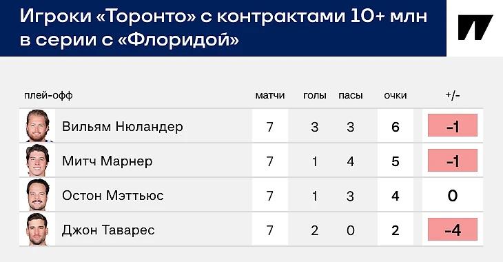 Тенденции были не в пользу «Торонто» – но это не значит, что их нельзя было сломать. Вот только некому оказалось. Четыре самых дорогостоящих игрока клуба – Остон Мэттьюс (13,25 млн в год), Вильям Нюландер (11,5), Джон Таварес (11 млн) и Митч Марнер (10,9) – в главном матче сезона не набрали ни одного очка. Хотя это не помешало им рассуждать об игре других.