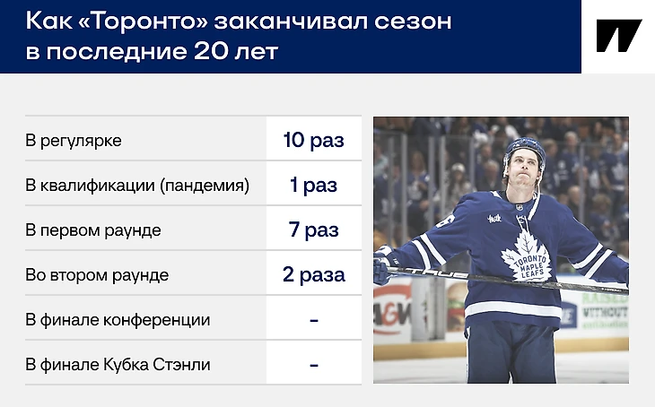 При этом забавно, что по факту это лучший сезон «Торонто» в эпоху потолка зарплат: 7 побед в плей-офф – такого не было с Кубка Стэнли-2002, когда клуб дошел до финала Востока. Хотя эта история не о силе «Лифс» сейчас, а больше о том, как плохи были дела в последние 20 лет: