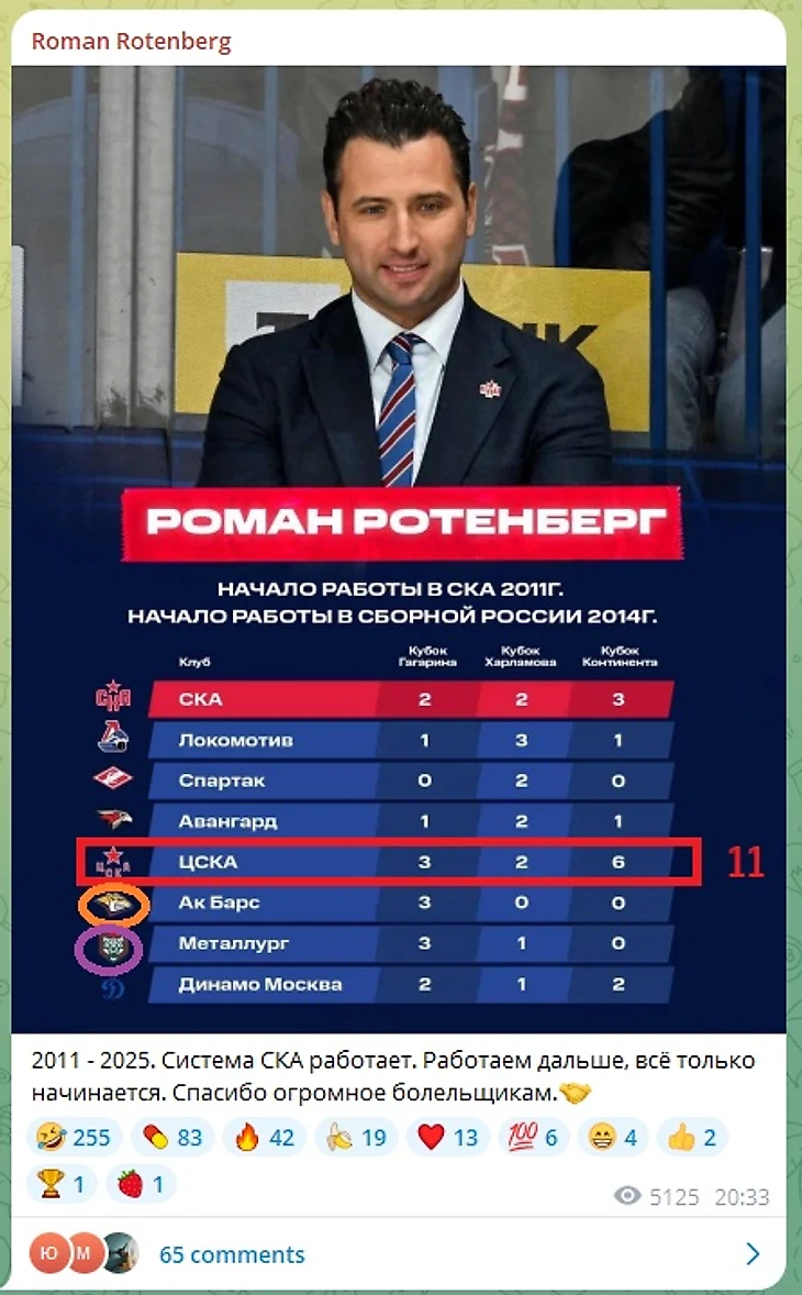 Роман Борисович Ротенберг выложил веские доказательства своей успешной работы в системе СКА, но не совладал с арифметикой. Ротенберг решил посчитать общее число трофеев с 2011 года, когда он начал работать в СКА.