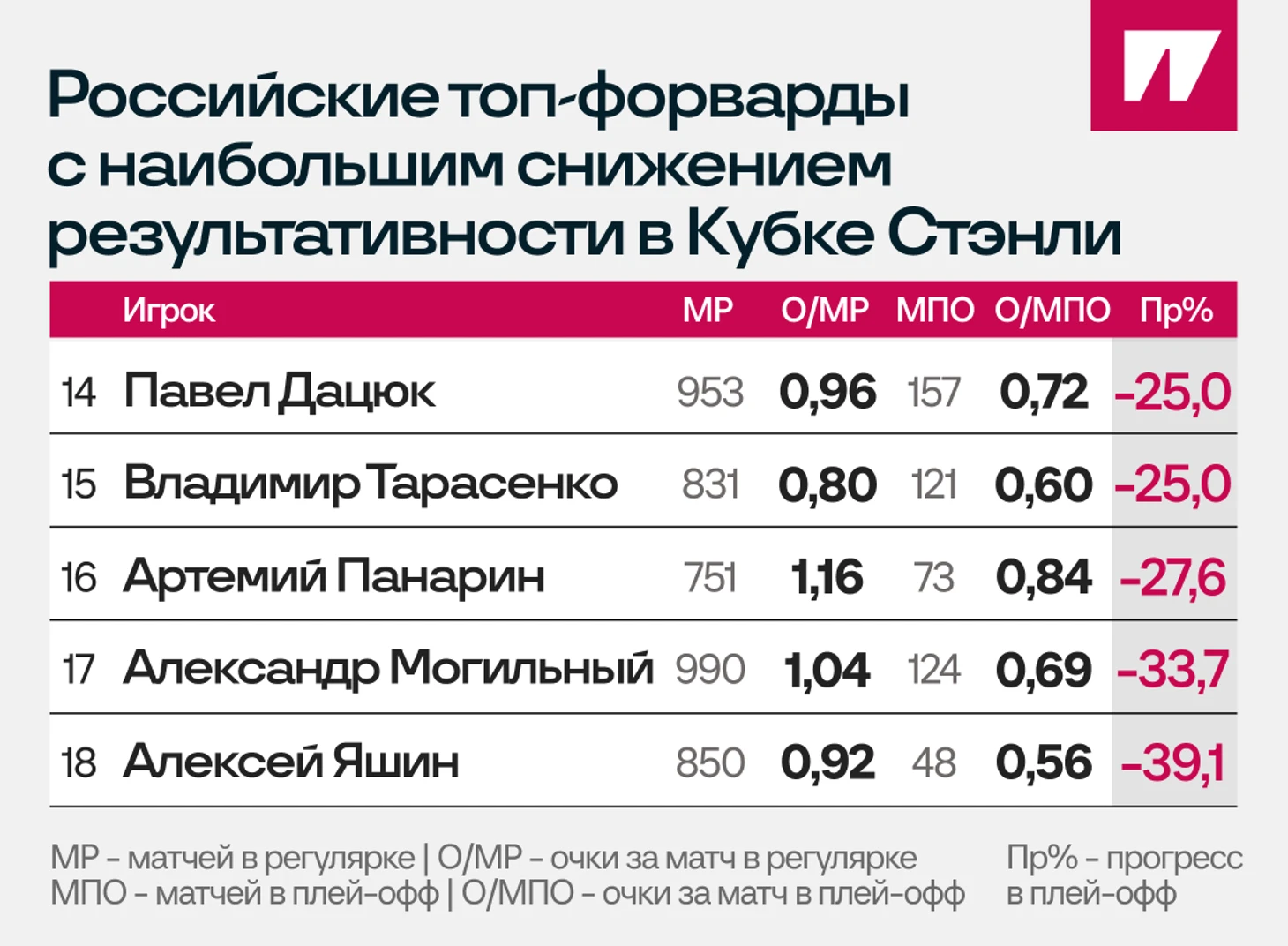 ● У Александра Могильного похожая история. За первые 7 лет в НХЛ провел 37 игр плей-офф за «Баффало» и «Ванкувер», набрав 39 (15+24) очков. Он имел на этом отрезке 1,2 очка в регулярках и терял в плей-офф только 12,5% результативности.