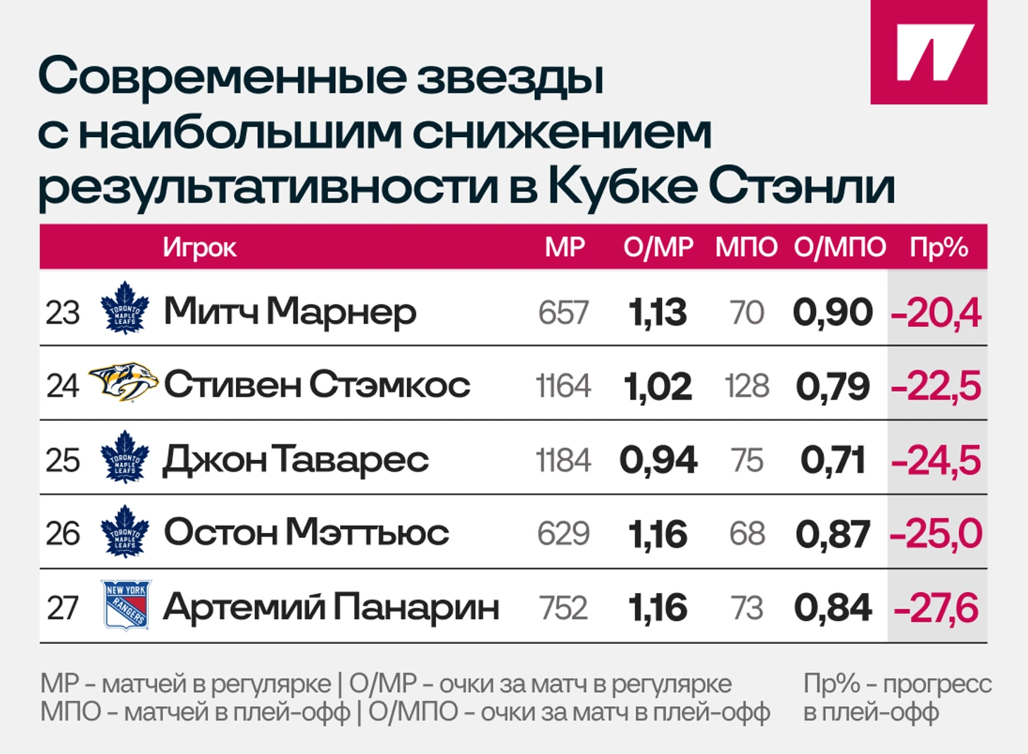 ● Замыкает список Артемий Панарин. Один из главных хоккеистов поколения успел поиграть за «Чикаго», «Коламбус» и «Рейнджерс», но только в «Блю Джекетс» его показатели в плей-офф соответствовали регулярке – 1,12 очка в 16 матчах Кубка против 1,06 в среднем за два сезона в «Коламбусе».