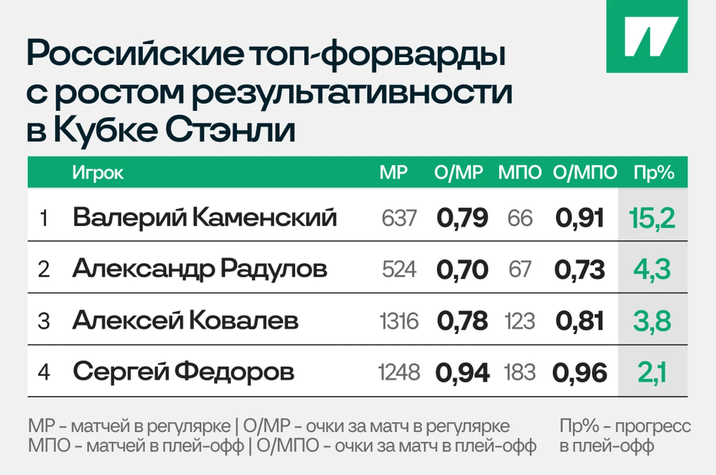 Метод подсчета тоже простой: берем среднее количество очков за матч в плей-офф у конкретного хоккеиста и делим на аналогичное число в регулярке. Получившееся значение переводим в проценты.