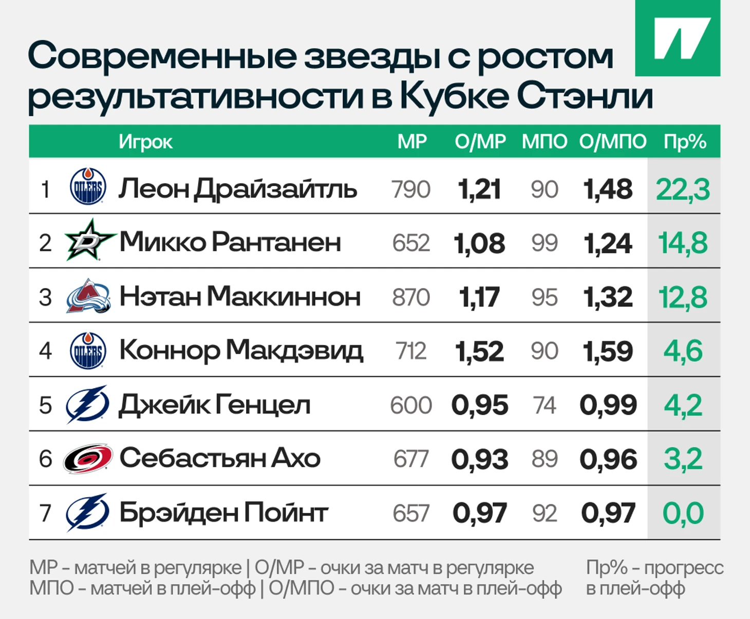 Зеленая – все хоккеисты, чья статистика становится лучше в плей-офф (+ Пойнт, у которого равенство по очкам в среднем за игру), красная – пятеро худших из тех, кто прошел по критериям из начала каждого подраздела.