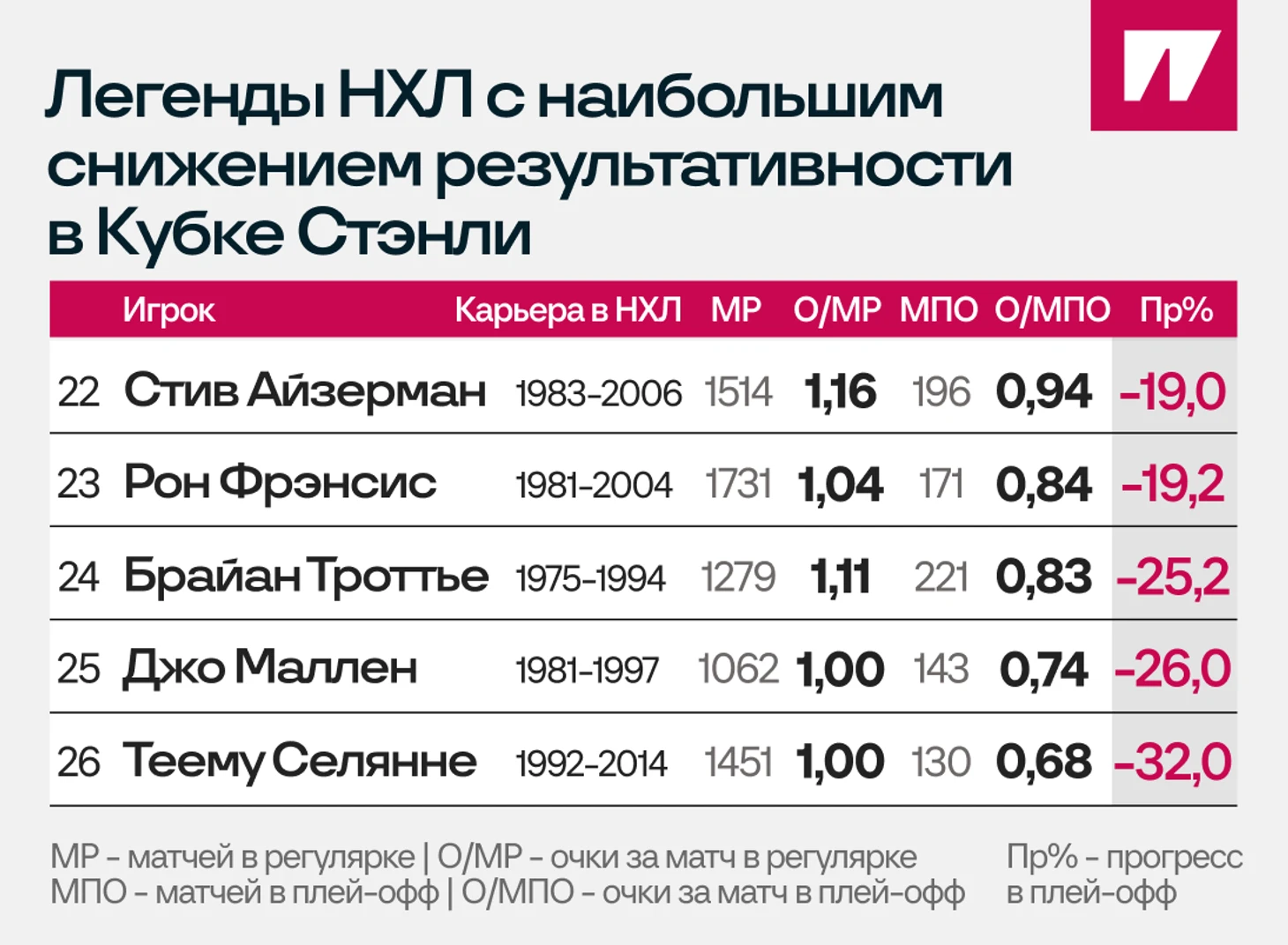 В расчет брались нападающие с карьерным показателем 0,85 очка за матч и более в регулярке, а также минимум с 60 играми в плей-офф. Таких набралось 27 человек.