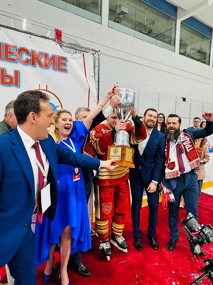 Затем пришла очередь капитана РУЭ Георгия Ларшина получить кубок, который он поднял вместе с руководителями МСХЛ и ректором ВУЗа.